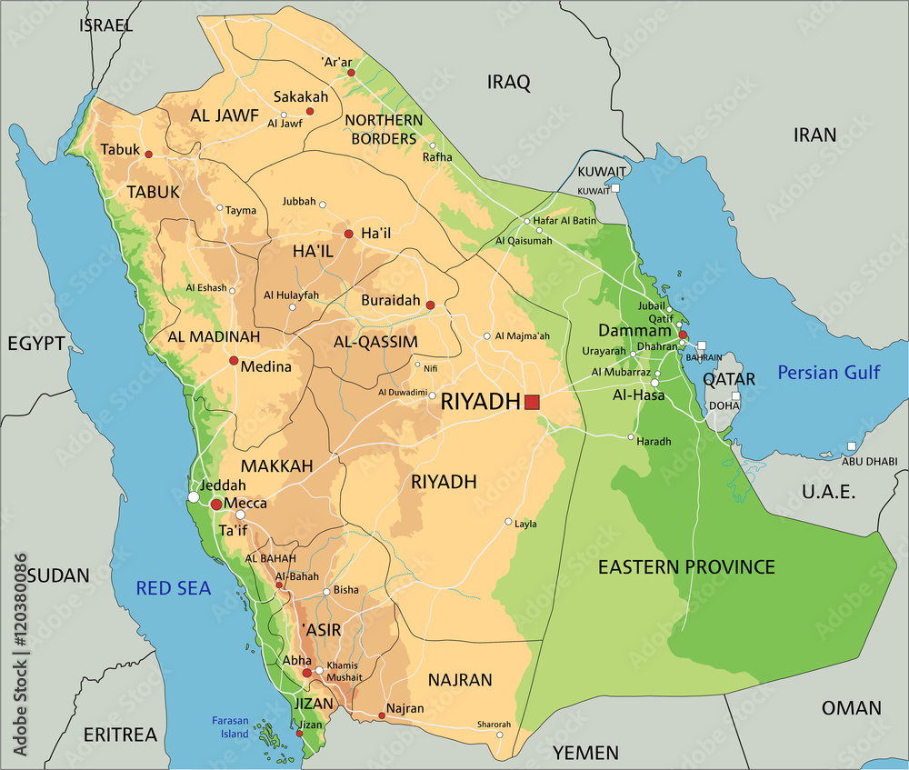 The Physical map of Saudi Arabia with administrative areas